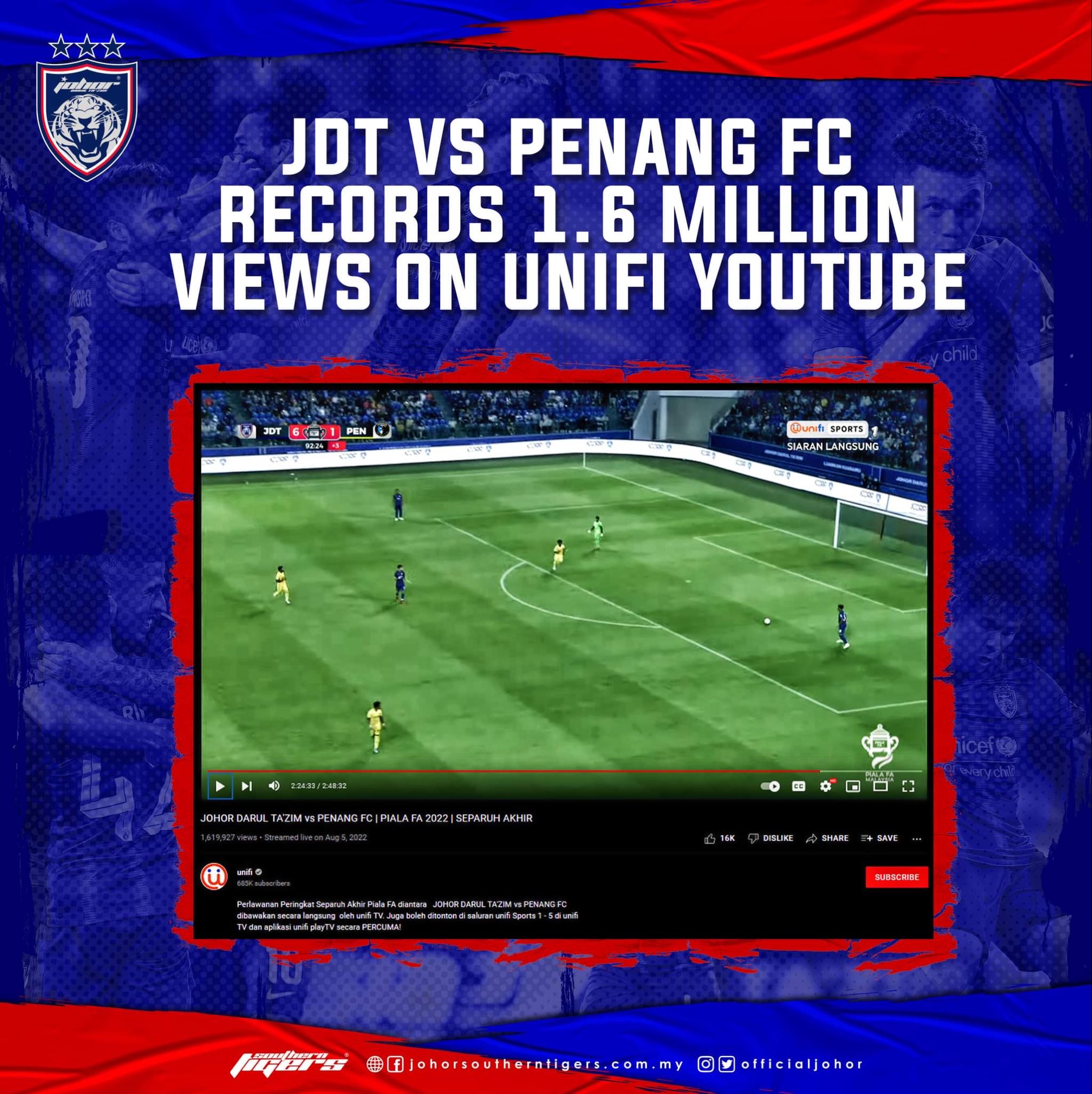 تويتر Johorsoutherntigers على تويتر Jdt Vs Penang Fc Records 1 6 Million Views On Unifi Youtube The Fa Cup Semi Final Match Between Johor Darul Ta Zim Fc Jdt And Penang Fc At The